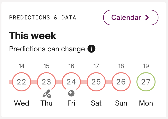 Unter den Vorhersagen findest du auch den Kalender. Wenn du darauf klickst, wirst du zur Kalender-Ansicht weitergeleitet. Dort kannst du den Fruchtbarkeitsstatus für vergangene Tage überprüfen und auch die Vorhersagen für die kommenden Wochen sehen.