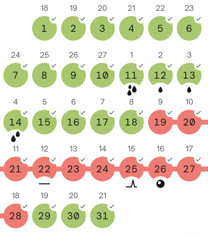 Schau dir am besten zuerst die einzelnen Definitionen in deiner App an (du findest sie ganz unten in der App). Zu jedem Symbol gibt es einen kurzen Text, der erklärt, was das jeweilige Symbol bedeutet. Außerdem findest du dort zusätzliche Infos zum Menstruationszyklus.