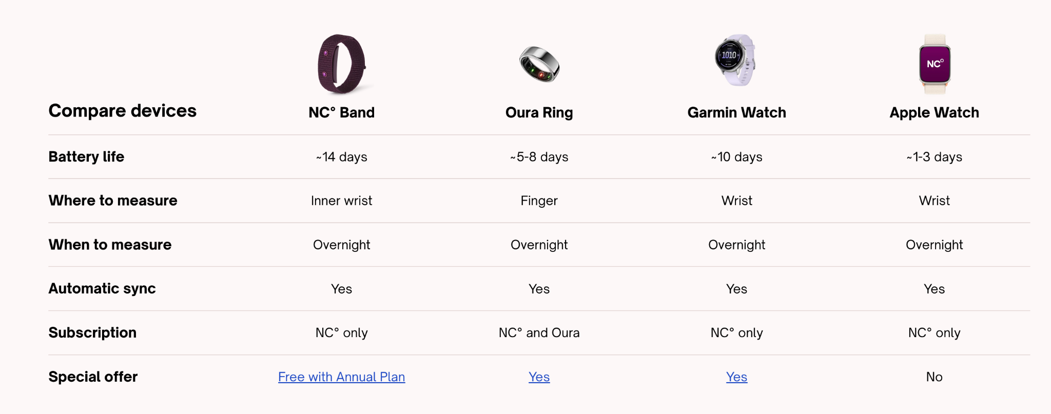 Currently, the only wearables Natural Cycles integrates with are the NC° Band, Oura Ring, as well as compatible Apple Watch and Garmin wearables.