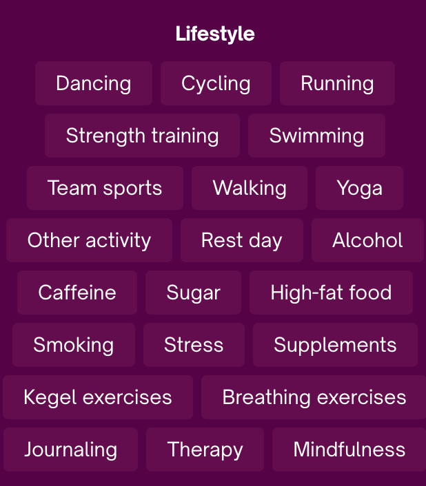 In this section, you can log some types of pain and symptoms that you might experience at certain times in your cycle, such as ovulation pain, bloating, or cramps.