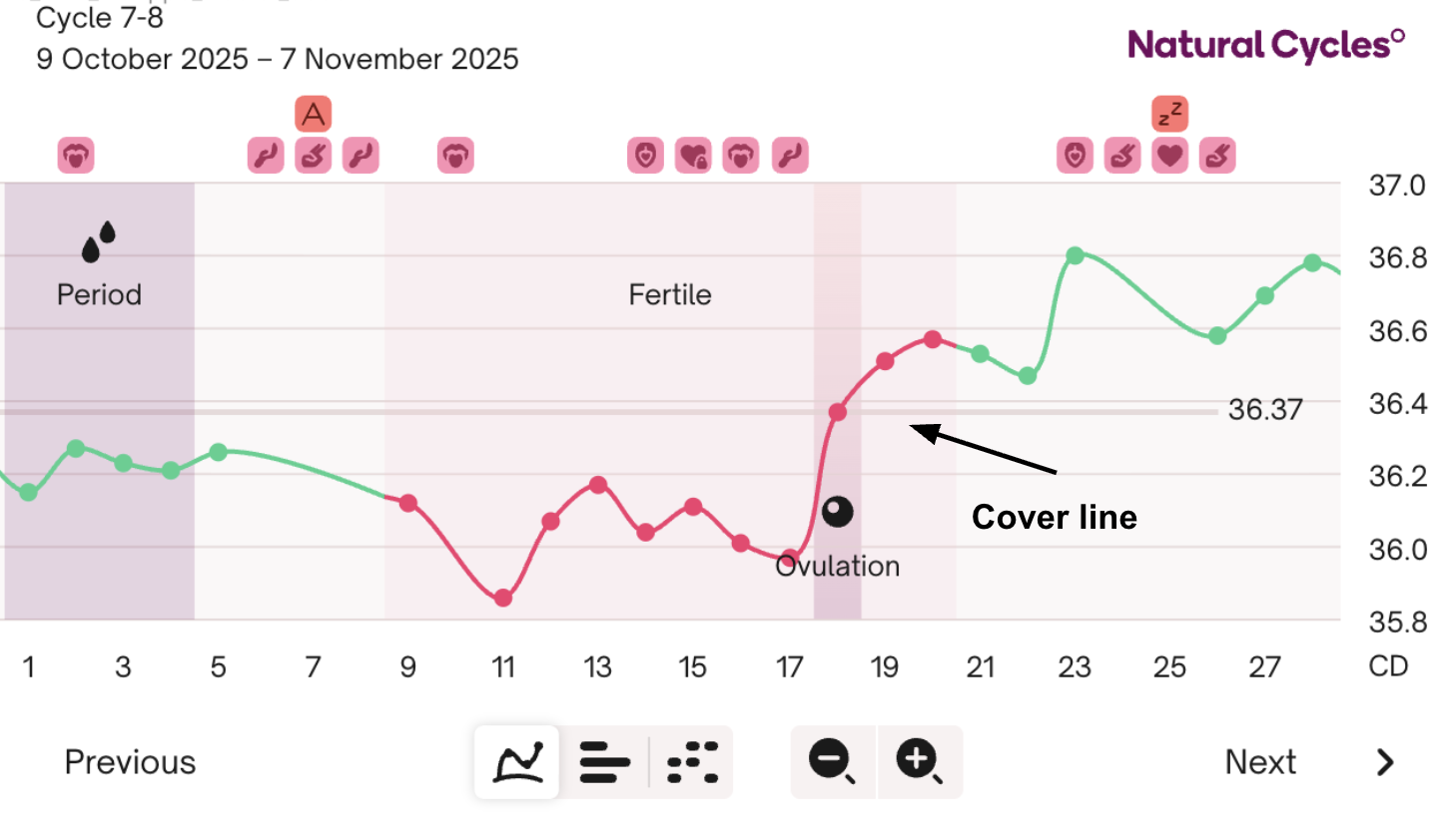 In your graph, you will see a thicker, gray, horizontal line. This is your cover line, which helps you visualize the temperature ranges that are associated with the follicular phase and the luteal phase, as well as the temperature shift that indicates ovulation.