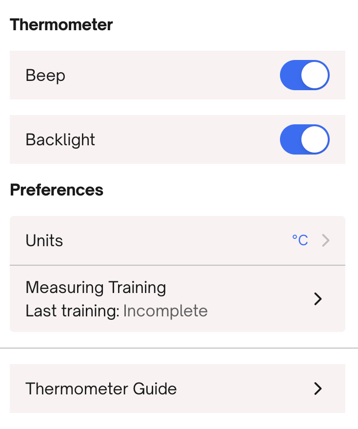 There, you can choose if you want the thermometer to beep, light up, or both when indicating that you should start and stop measuring. You need to have at least one of these options enabled at all times.
