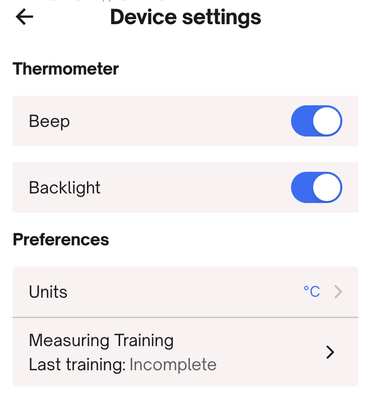 To make sure that you are measuring correctly and that your thermometer is working as it should, we always recommend completing the Measuring training in the app when you get started with Natural Cycles, which you can find under the top menu > My device > Device settings.