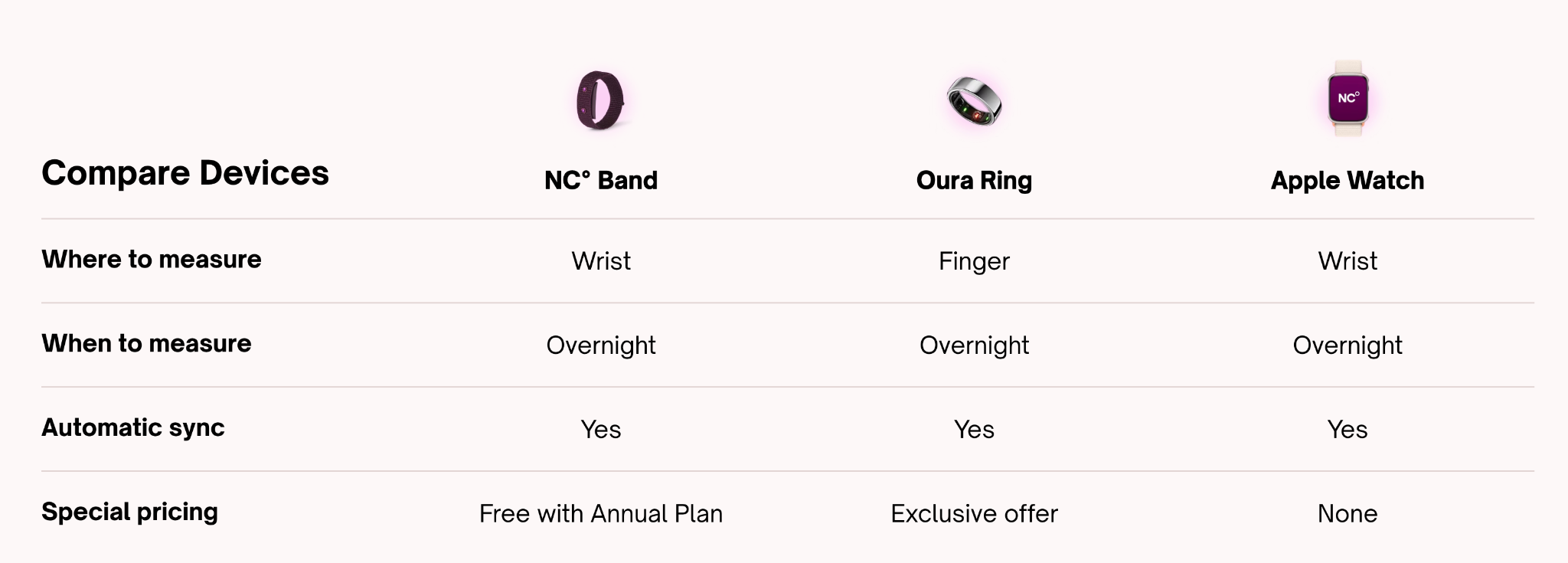 Usar un dispositivo portátil simplifica tu rutina: Usa el dispositivo mientras duermes, sincronízalo con la app NC° por la mañana y revisa tu estado de fertilidad. Este proceso automatizado significa que no necesitas preocuparte por mantener un horario de sueño regular o una rutina matutina estricta: el dispositivo se encarga del seguimiento por ti.