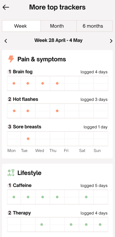 - Informations sur les trackers : Cet onglet vous permet d'identifier vos tendances personnelles et de découvrir vos schémas uniques. Dans la section Analyse approfondie des symptômes, vous trouverez également plus de détails sur chaque tracker pour mieux comprendre pourquoi il est important de le suivre, ce qu'il représente et quand vous devriez envisager de consulter un médecin.