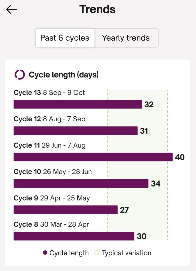 A página de Insights do Ciclo também inclui sinalizações úteis como "Atípico" e "Irregular". A sinalização "Atípico" identifica ciclos únicos que estão fora do padrão médico, enquanto a sinalização "Irregular" indica quando a média geral do ciclo se desvia do intervalo esperado. Para saber mais, você pode ler este artigo: Por que meu ciclo foi sinalizado como atípico ou irregular?