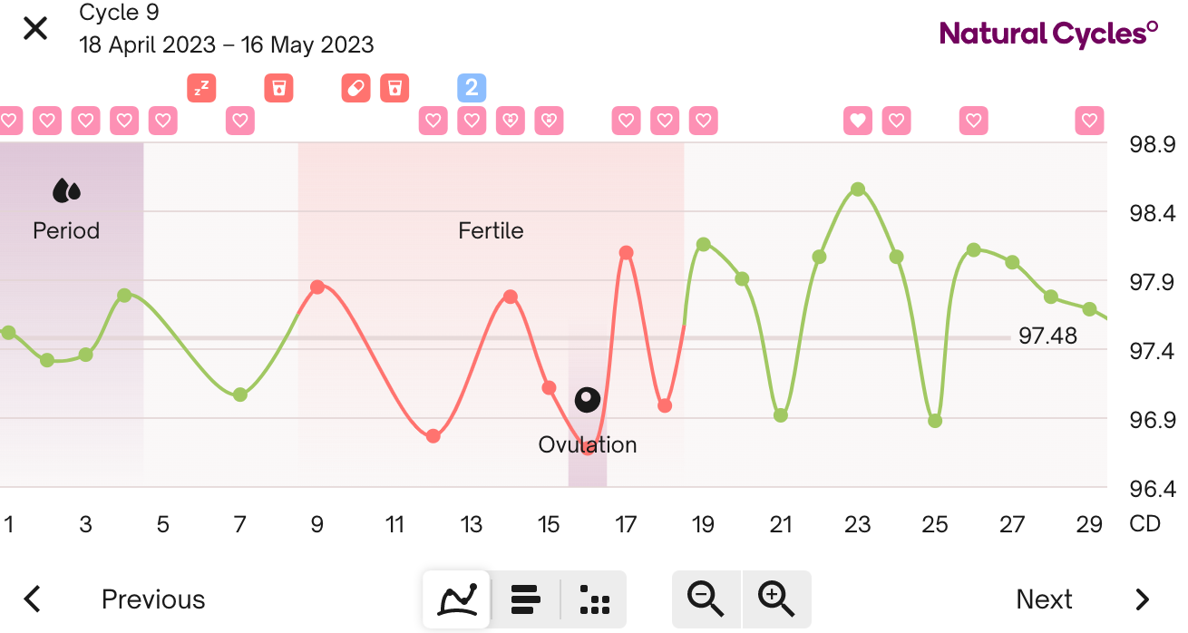 På cykeldagarna 21 och 25 (lutealfas) sjönk temperaturen plötsligt under medellinjen – detta räknas som en temperaturfluktuering eftersom temperaturen är ovanlig för den här fasen av cykeln.